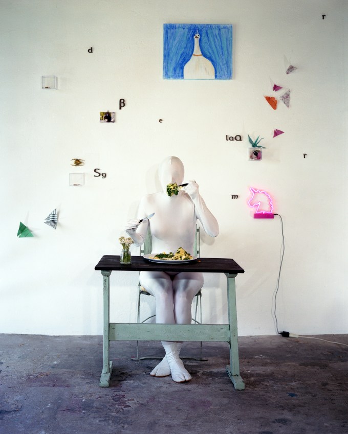Inmitten einer surreal anmutenden Szenerie, gekennzeichnet durch eine unkonventionelle Anordnung von skurrilen Gegenständen an einer weißen Wand, darunter Buchstaben ohne Sinn, ein goldener Käfer, Origamifalter, ein Keramikbild mit einem Eichhörnchen und ein Neoneinhorn, beginnt die Performerin die Herausforderung, Nahrung aufzunehmen.