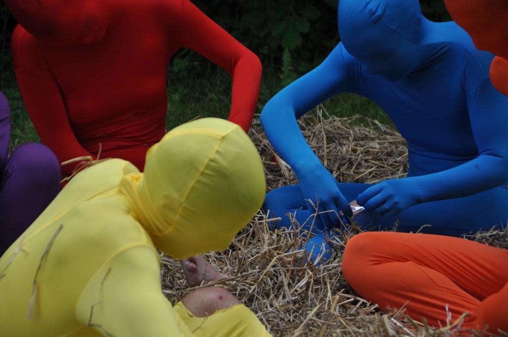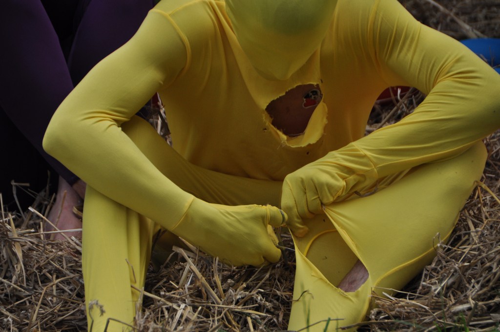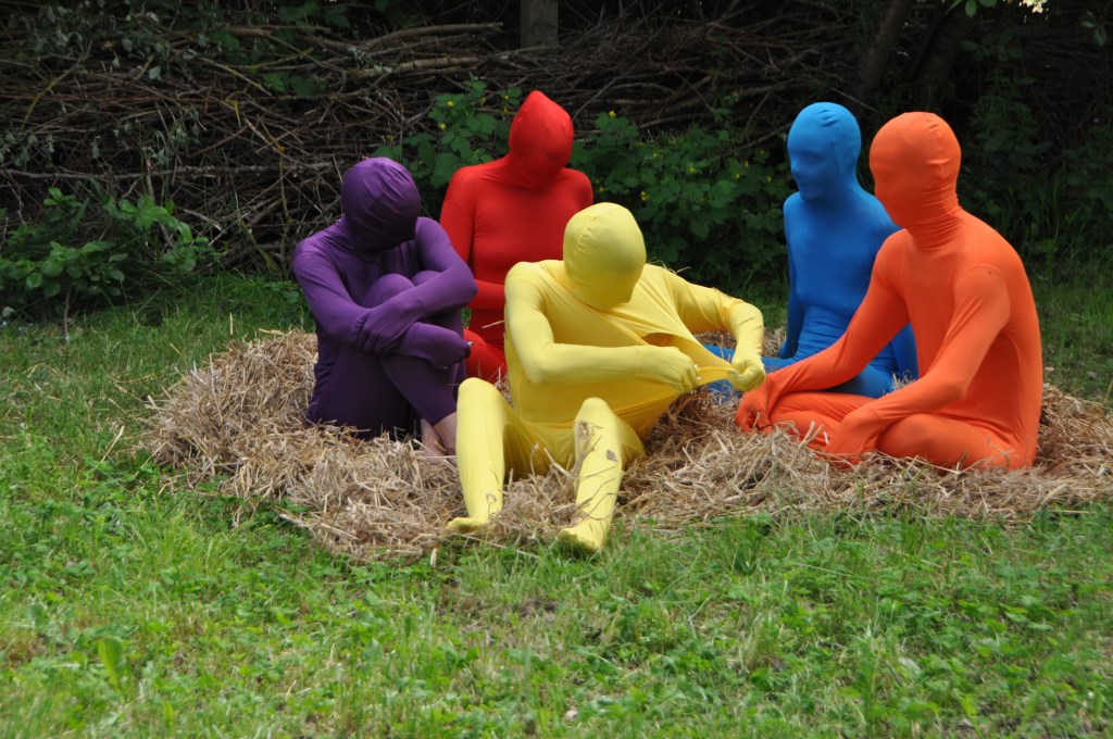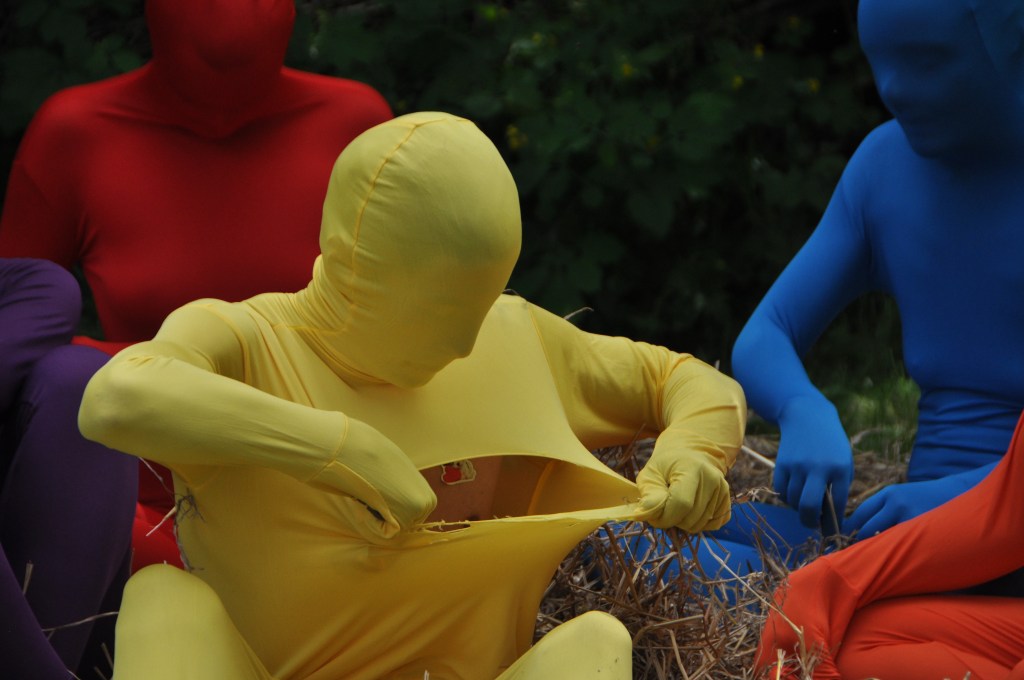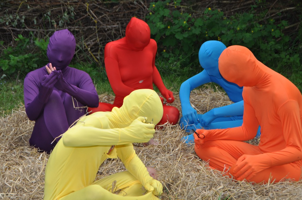 Die Performer beginnen langsam, sich mit Scheren aus ihren Anzügen zu befreien. Jeder Schnitt ist eine symbolische Handlung der Befreiung und Reinigung.