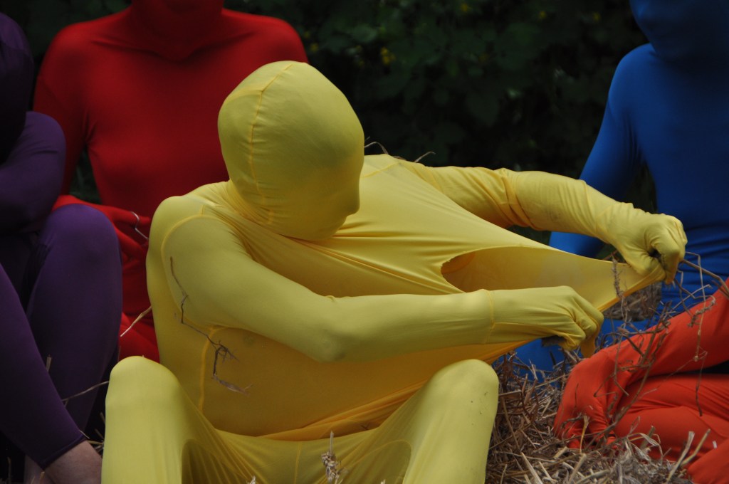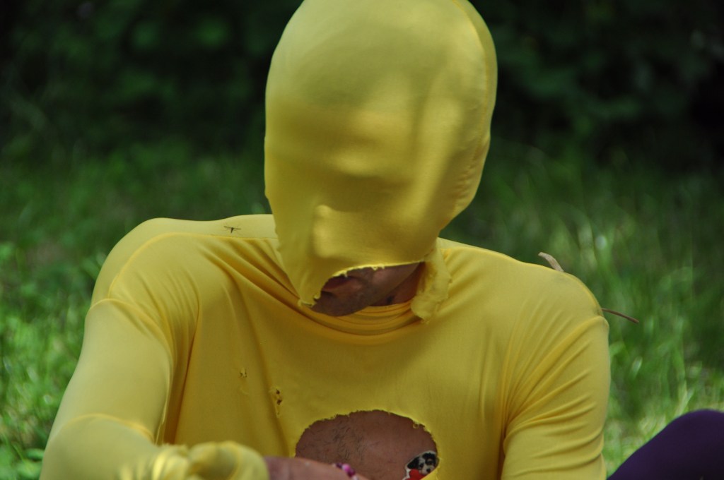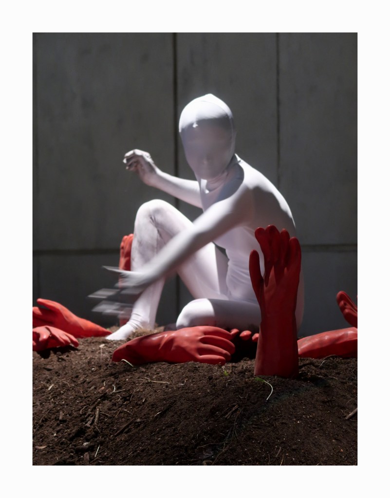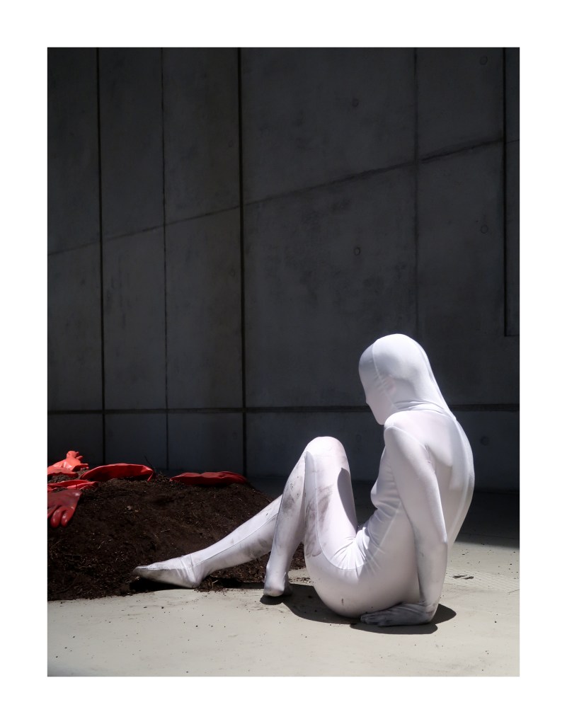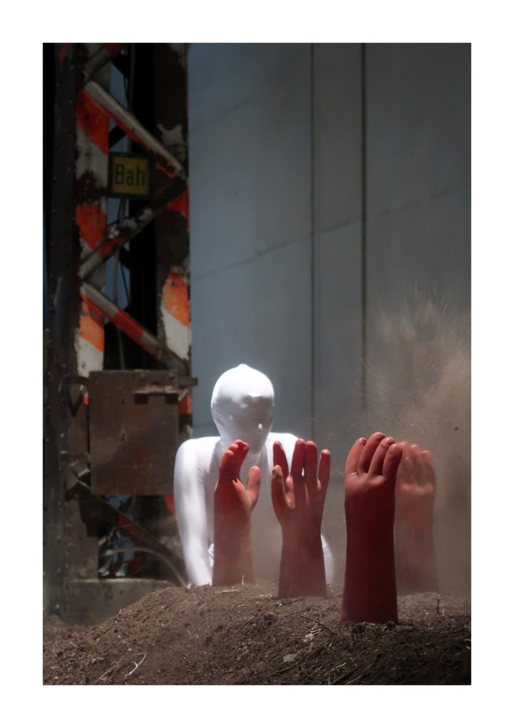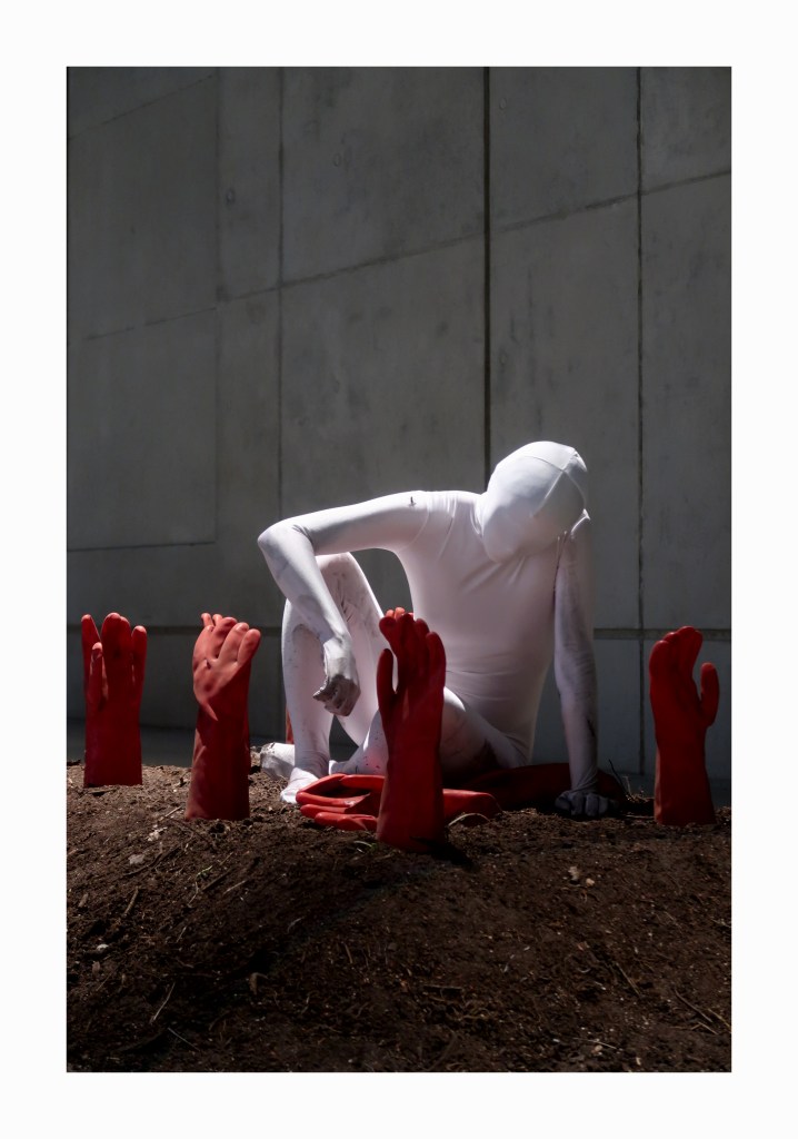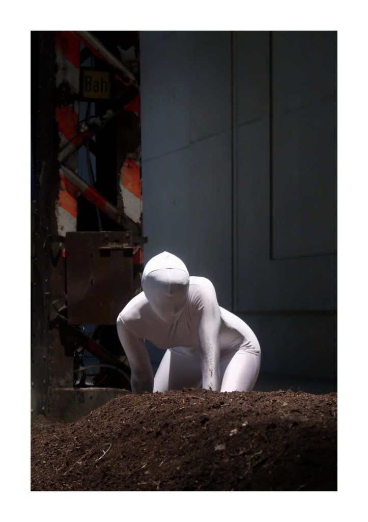 Die Performance „An vollen Töpfen verhungern““ ist eine eindringliche Darstellung, die die Verbindung zwischen dem Individuum und seiner Umwelt untersucht. Die Performerin trägt einen weißen Ganzkörperanzug, der sie fast vollständig bedeckt, wobei lediglich ein kleines Loch an der Stelle des Mundes bleibt. Vor ihr steht ein Tisch, auf dem sich ein Teller mit Spinat, Kartoffelbrei und einem Spiegelei nebst Besteck befindet.