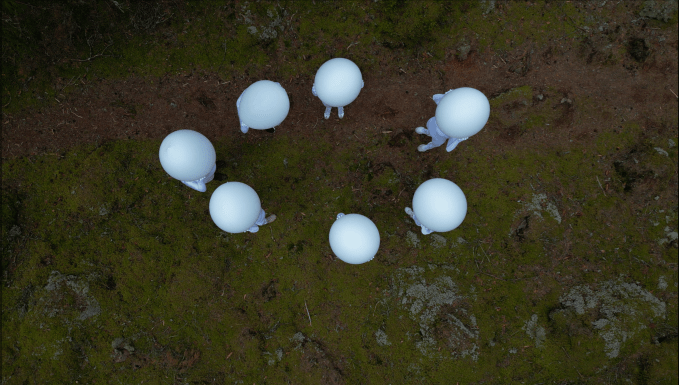 Die Reise führt sie durch unterschiedliche Landschaften: eine weite Wiesenlandschaft, einen dichten Wald und ein offenes Feld. Auf allen Vieren bewegt sie sich durch die Umgebung, ihre skurrilen Bewegungen erzeugen eine surreale Atmosphäre.