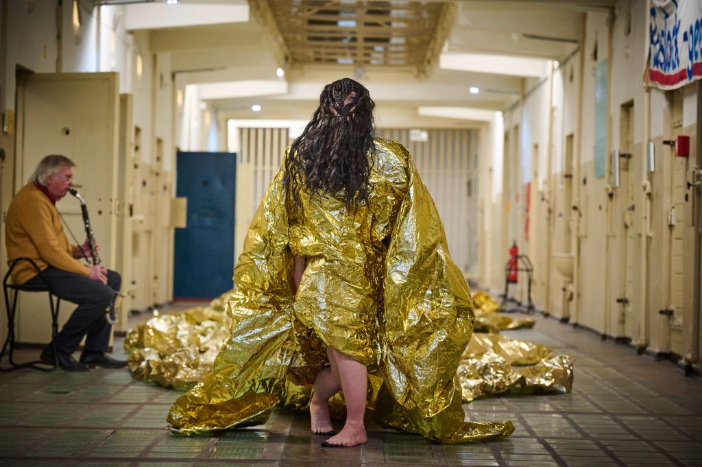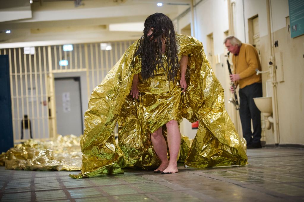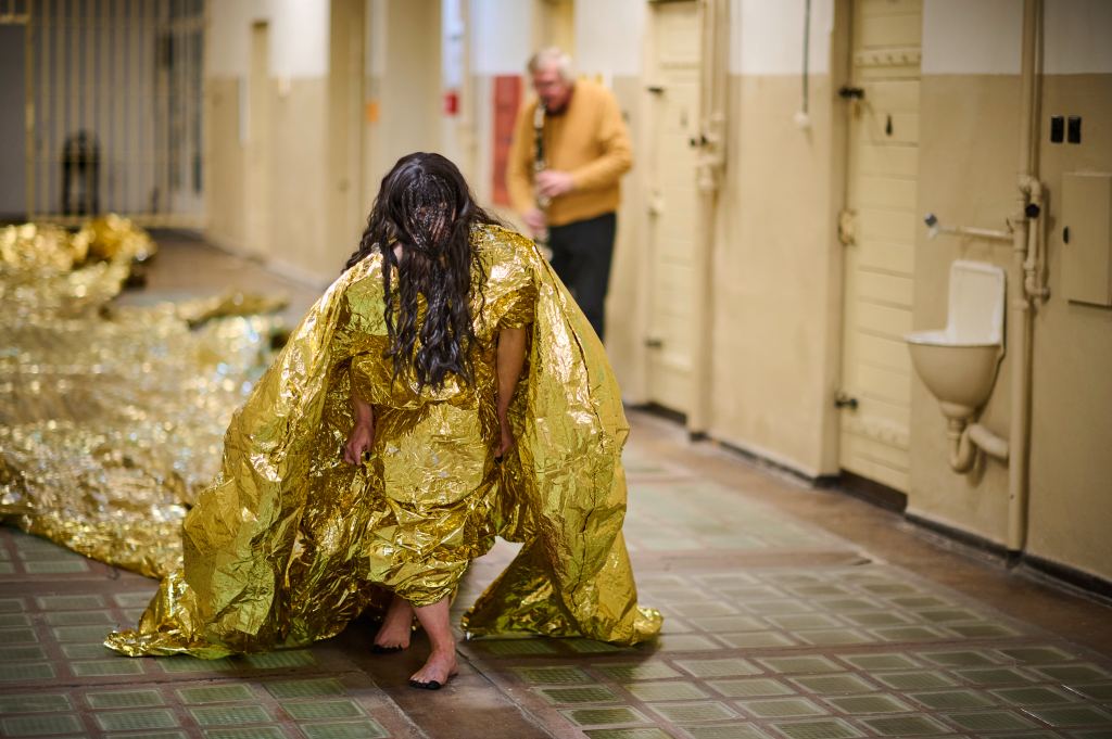 Im ehemaligen Stasi-Gefängnis in Rostock durchquert die Performerin langsam den schmalen Flur – begleitet von der live improvisierten Musik Jörgensmanns. Mit jedem Schritt enthüllt sie einen 30 Meter langen Umhang, gefertigt aus goldenen Rettungsdecken und zu Hemden geformt (Hundrich). Der Umhang, Symbol von Schutz und zugleich Last, entwickelt sich zunehmend zum Widerstand – körperlich wie metaphorisch.